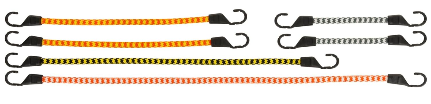 Keeper Flat Bungee Cords have an exclusive flat cord design that spreads load weight evenly for efficiency and won't dig in like round cord that can damage cargo. The cord is fabricated from first quality rubber and sheathed in a UV resistant outer jacket in bright, visible colors. Oversized hooks with a steel core make them three times stronger than conventional hooks. A protective coating that will never rust or mar paint ensures secure cargo transport and long product life. Available in a multi-pack of six cords in varying sizes, Keeper Flat Bungee Cords provide a versatile and dependable solution for everyday cargo transport. 6 Pack contains (2) 15", (2) 25", (1) 35", (1) 45" bungees.