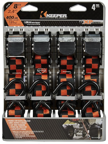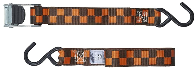 The Keeper 8 ft. Cam Buckle Tie-Down features a durable 1.25 in. Hi-Test webbing and steel cam buckle with teeth grip for a tight and secure hold. The hooks can be affixed to rings, hooks, anchors, D-Rings, and other cargo anchors. Simply attach the S-Hooks to an anchor point, strap over cargo, pull the strap to the desired tension, and close the cam buckle to secure the strap. The tie-down is compact, portable, and easy to use. It is ideal for light-duty applications.