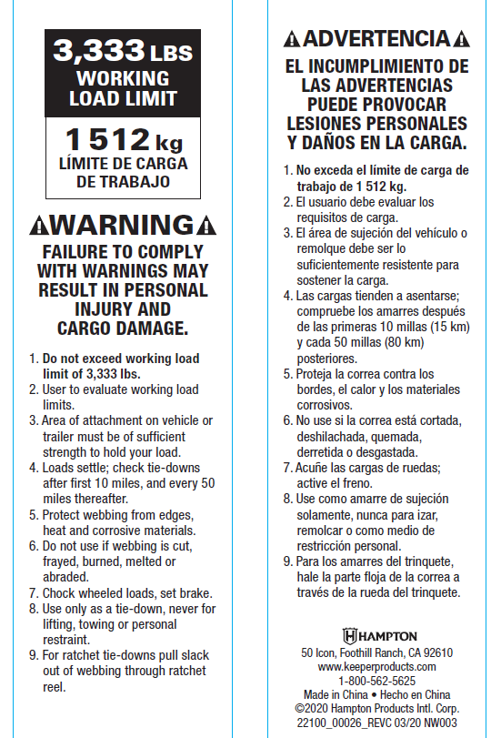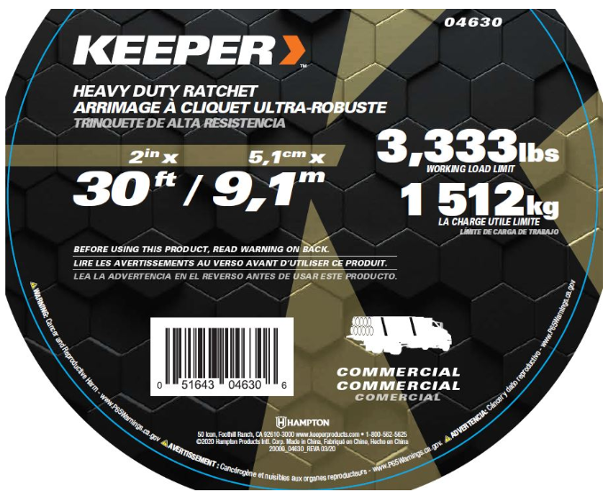 The Keeper® 30 ft. Ratchet Tie-Down features an abrasion and rot resistant 2 in. Hi-Test® webbing to absorb shock during transportation. It is constructed with a steel ratchet buckle, extra long open molded handle, and double J-hooks. To engage attach the hook to an anchor point, pull webbing over the cargo load and tug to desired tension. Ratchet by raising and lowering the handle to lock the cargo into place.