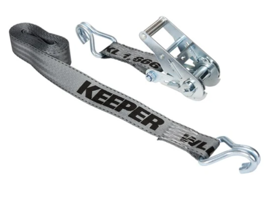 The Keeper® 15 ft. Ratchet Tie-Down features an abrasion-resistant 1-3/4 in. webbing to asorb shock during transport, corrosion-resistant ratchet buckle, open molded handle, and double J hooks. The ratchet buckle is designed with a rotating gear and lever mechanism latch to tighten and secure your load. To engage attach the hook to an anchor point, pull webbing to desired tension leaving a bit of slack and ratchet by raising and lowering the handle. The webbing then locks into place to secure your cargo.