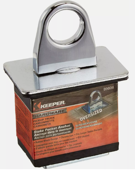 Chrome Stake Pocket Anchor Points are designed to provide the best available truck anchor for all varieties of tie-downs. These anchors attach securely to a pickup truck's stake pockets and do not require any drilling. Expandable rubber blocks are versatile enough to fit all stake pockets and won't rust or damage the truck. When the block is inserted, the eye is turned to expand the rubber, making installation quick and easy. The durable eye is performance manufactured from high quality materials and comes in an attractive chrome color. Keeper? anchors are the ideal choice for attaching tie-downs to pickup trucks. Chrome plated eye With oversized rubber block Anchor point The eye is turned to expand the rubber, making installation quick and easy Ideal choice for attaching tie-downs to pickup trucks.
