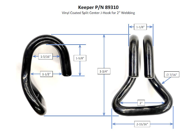 KEEPER®'s Split Center J Hooks allows the webbing to feed through the center of the hook to provide a movable anchor position. It has a vinyl coating that won't mar paint. It fits up to 2 in. webbing, has a 1000lb working load limit and a 3,000 lbs. break strength. Use it to secure loads from shifting. Works with both O-Tracks and E-Tracks.