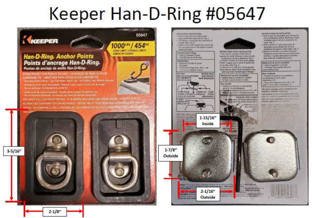 KEEPER®'s Han-D-Ring® Anchor Points are engineered to outperform other full-size pickup truck anchors on the market in strength, convenience, and reliability. Easy-to-install anchors eliminate the need for drilling or special tools, quickly attaching by means of an included hex wrench. Stainless steel Han-D-Ring® technology accommodates loads up to 1,000 lbs. and is large enough for two S-hooks. Designed especially for full size trucks, KEEPER® Han-D-Ring® anchors lay down flush when not in use, making them the perfect solution for heavy duty transportation.