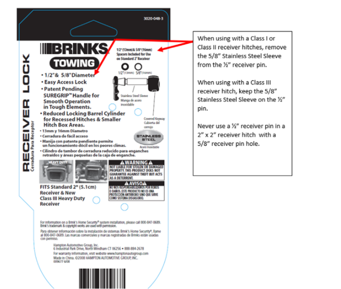 - This 3020-048 locking receiver hitch pin is universal for the 1-1/4” x 1-1/4” Class I & Class II receiver hitch and 2”x 2” Class III receiver hitch.