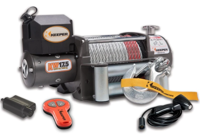 The KW17.5 Winch is ideal for large 4x4 trucks and heavy-duty trailing applications. Built with a 6.0 HP series wound 12v DC motor, 4-Way roller fairlead and full-load holding break to ensure safe operation. The life and turn free-spool clutch makes connections quick and easy to get users back on the road. As standard equipment on all KW Series winches, the wireless remote allows users the freedom to position themselves in the best spot during recovery.