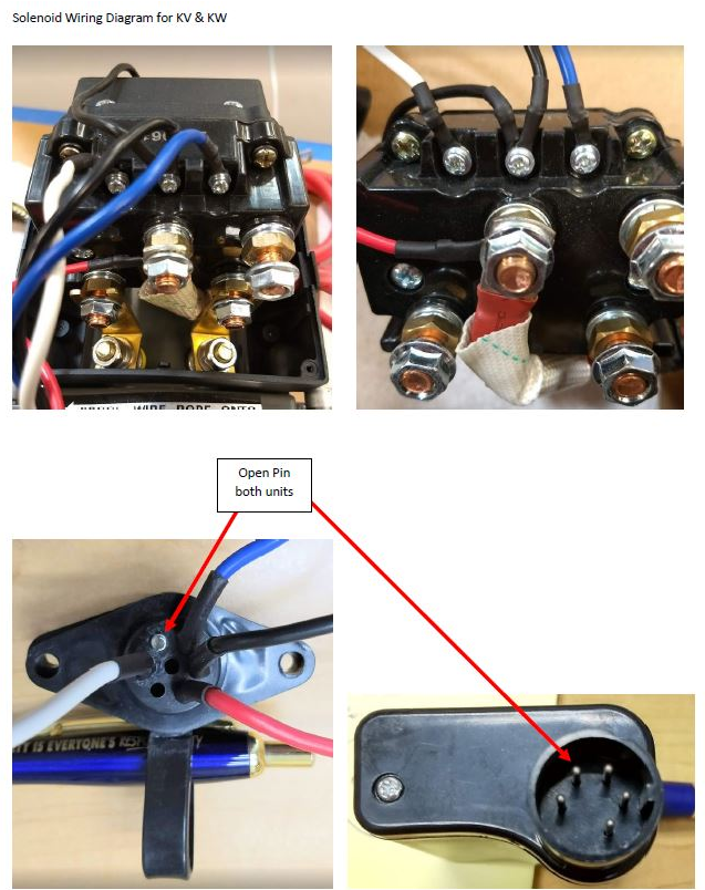 - Change the White and Blue wire on the solenoid, (BE VERY CAREFULL) this will reverse the winch’s direction. OUT will now be coming IN and IN will now be going OUT. But this will confirm if the solenoid has a one directional pole/contact failure.