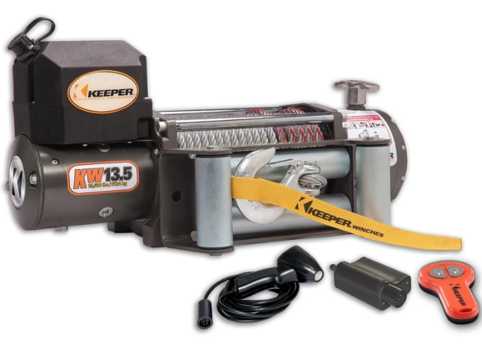 The KW13.5 Winch is ideal for all custom Jeep class vehicles and full sized 4x4 trucks. Built with a 6.6 HP series wound 12v DC motor, 4-Way Roller Fairlead and full load holding break to ensure safe operation. The lift and turn free-spool clutch makes connections quick and easy to get back on the road. As standard equipment on all KW Series winches, the wireless remote allows the user the freedom to position themselves in the best spot during recovery. The 13,500 lbs. single line pull rating and 265:1 gear ratio is the perfect match for long term reliable performance.