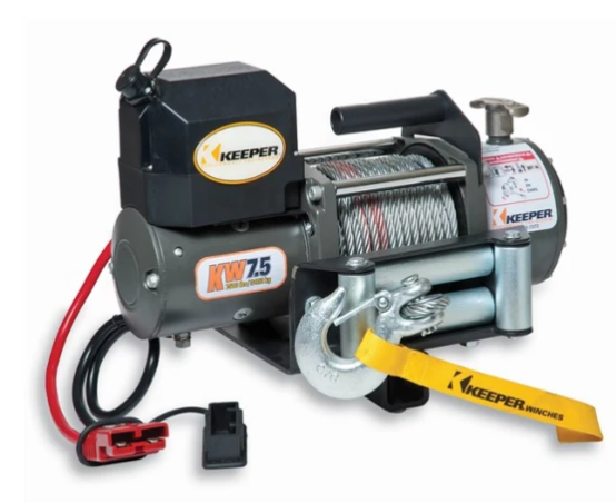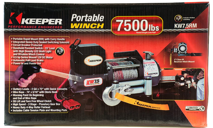 The KW7.5RM (Rapid Mount) is packed with features essential for efficient and reliable portable operation. 4.5 hp series wound 12v DC motor, Automatic full load holding brake, 72 ft. of 5/16 in. wire rope w/ clevis hook, Lift & Turn Free-Spool Clutch, High speed planetary gear box, case hardened gears, heavy duty 4-way roller fairlead, wireless remote and handheld switch with 15 ft. lead and LED light. Power in / power out operation. Slides into Any Class III 2 in. Receiver Hitch. 7,500 lbs. of pulling power (single line rated)