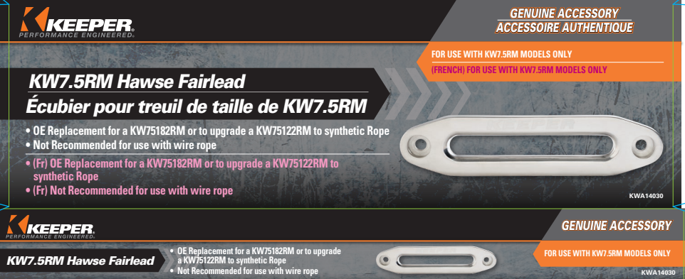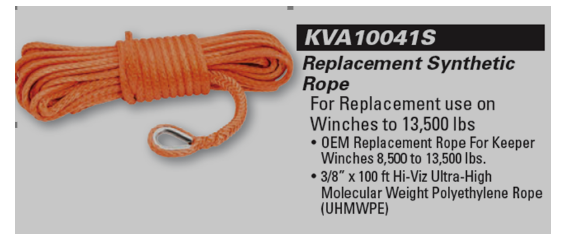 - Synthetic rope is 3/8” dia. vs the 5/16” dia. Steel Cable that is stock on the KW7.5RM from Keeper.