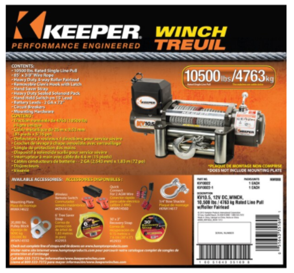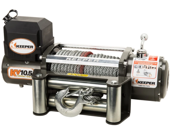 The Keeper KV10.5 is a heavy-duty, mid-range winch that provides power, versatility, and durability essential for self and aided recovery, trailers, and four-wheel drive users. The winch features a highly efficient 5.5 HP 12V DC motor, automatic mechanical full load holding break for safety and has 10,500 lbs. single line pull capacity. It is equipped with a three-stage planetary gear box for fast and smooth line speed, heavy-duty 4-way roller fairlead, a 15’ lead handheld remote control with integrated LED high density work light.