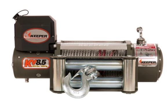 The Keeper KV8.5 is a heavy-duty, mid-range winch that provides power, versatility, and durability essential for self and aided recovery, trailers, and four-wheel drive users. The winch features a highly efficient 5.5 HP 12V DC motor, automatic mechanical full load holding break for safety and has 8,500 lbs. single line pull capacity. It is equipped with a three-stage planetary gear box for fast and smooth line speed, heavy-duty 4-way roller fairlead, and a 15 ft. lead handheld remote control with integrated LED high density work light.