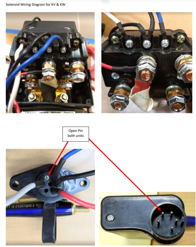 - Change the White and Blue wire on the solenoid, (BE VERY CAREFULL) this will reverse the winch’s direction. OUT will now be coming IN and IN will now be going OUT. But this will confirm if the solenoid has a one directional pole/contact failure.