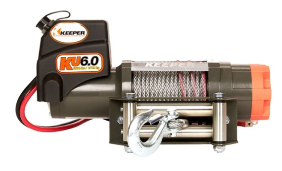 The Keeper KU6.0 is a high-performance utility winch that provides power, versatility, and durability essential for utility application users. It featuring a highly efficient 1.9 HP 12V DC motor, automatic full load holding break for safety and a maximum rating of 6,000 lbs. single line pull. The winch is equipped with a three-stage planetary gear train for fast line speed, a handheld remote control for power in/out control and a high intensity LED work light.