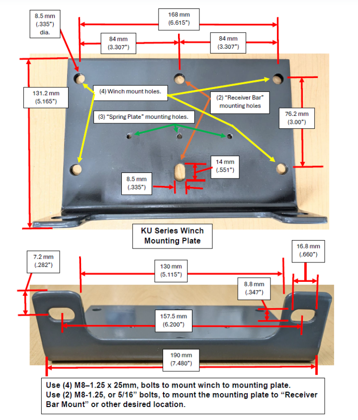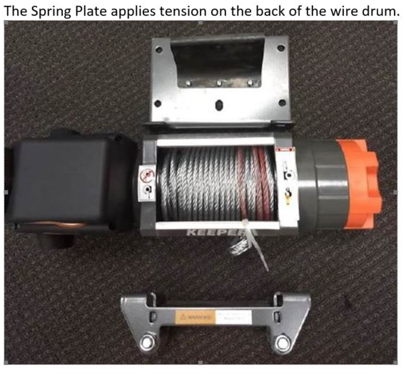 The curved plate is held onto the mounting plate with 3 screws and locking washers. The curve of it will be orientated towards the rear of the winch and keeps tension on the rope when the unit is put into Free-spool mode (clutch released), this prevents the rope from doing what we call “Birds Nest” or releasing all of its tension and making a big mess of the rope. This will apply a small amount of pressure against the winch / mounting plate when the customer attempts to mount it with the mounting bolts.