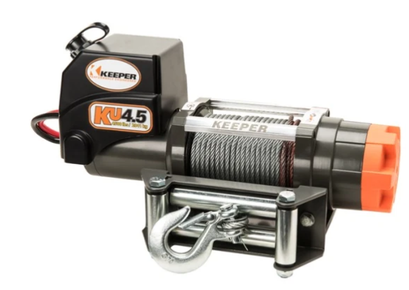The Keeper KU4.5 is a high-performance utility winch that provides power, versatility, and durability essential for utility application users. The winch features a highly efficient 1.5 HP 12V DC motor, automatic full load holding break for safety and a maximum rating of 4,500 lbs. single line pull. It is equipped with a three-stage planetary gear train for fast line speed, a handheld remote control for power in/out control and a high intensity LED work light.