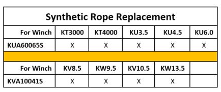 The original Cable size on the KW7.5/KW75122RM winch is 72’ x 5/16” and the KVA10041S synthetic rope is 100’ x 3/8”. Cut about 25 – 28 feet from the synthetic rope to convert. No Hawse Fairlead available for the KW7.5/KW75122RM