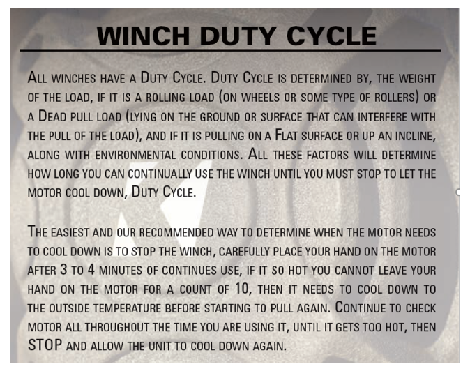 When winching for extended periods of time, an electric winch has an Achilles heel – its motor. This component can fail if you don’t pay close attention to the heat build up while you winch. Electric winches don’t have a 100 percent duty cycle (like a hydraulic winch) and need a rest occasionally from their work. This “rest” allows the electric winch cool down and build up an electrical reserve in the battery from the engine’s alternator.